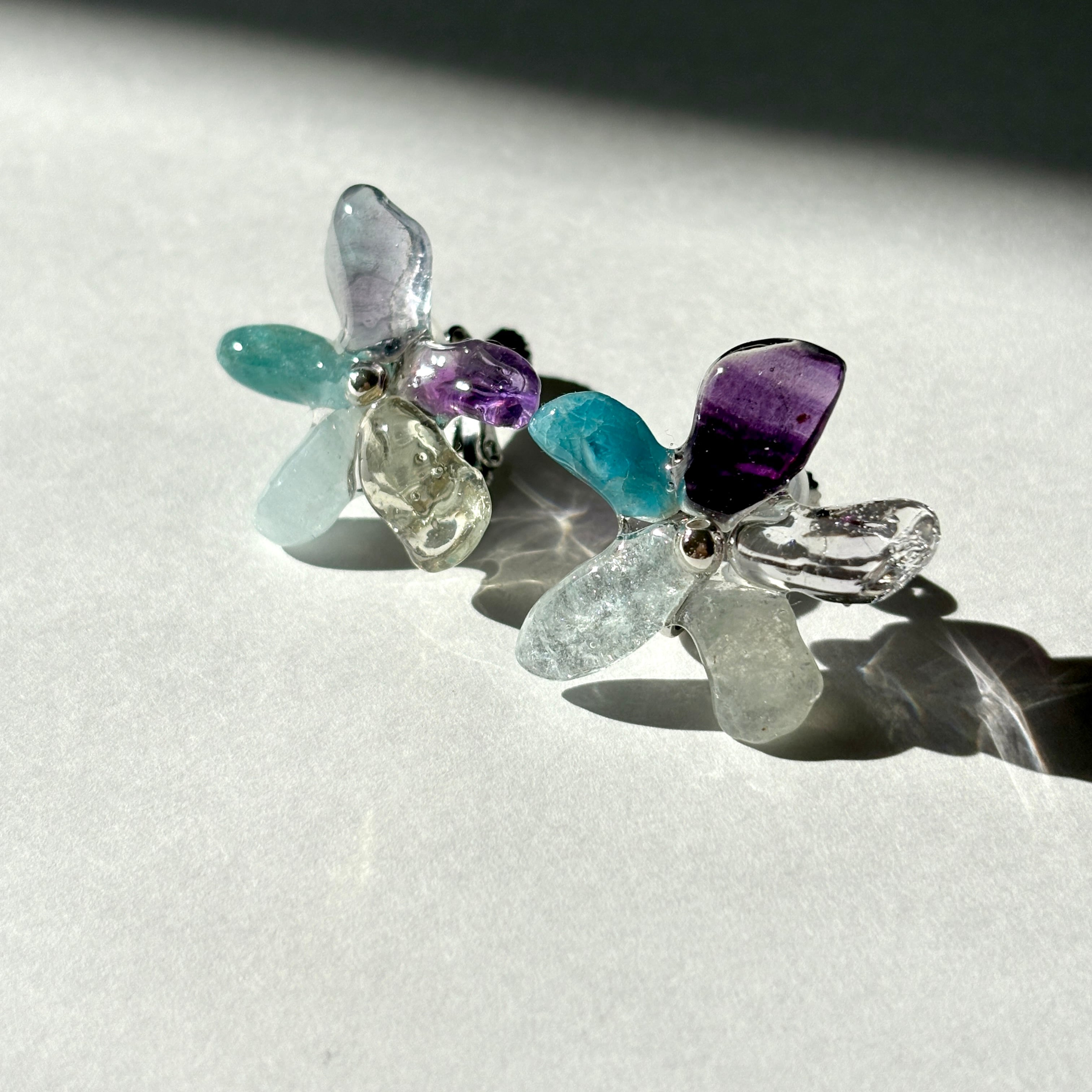 天然石を組み合わせてハートの形を作った人気の耳飾りです。 アメジストとブルーのベリルを使用しています。 ハートモチーフをさりげなく、大人っぽく身につけられるアイテムです。 全て一点モノです。 【金具】サージカルステンレス