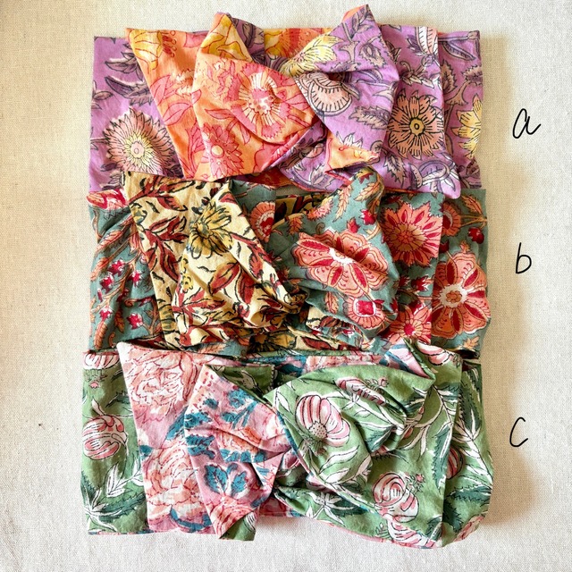インドのハンドブロックプリントを使用したワイヤーターバンです。 表と裏、リバーシブルでお使いいただけます。 トップでひねってZ型に折り込むだけでリボンのような仕上がりに。 カチューシャやゴムのヘアバンドで頭が痛くなる方にも、締め付けなくおすすめです。 中にはアルミワイヤーが一本入っており、布とは繋がっていません。 アルミワイヤーの端(渦巻状になっています)と、生地の端を合わせて引っ張るだけでまっすぐになります。 手洗い可能です。色落ちしやすい生地のため、洗剤は使用しないか、オシャレ着用を数滴が良いです。 説明書を同封します。 インスタグラムでは巻き方も投稿しております。 お修理としてワイヤーの入れ替えも可能です。 【ハンドブロックプリント】 インドの伝統技法です。模様を丁寧に彫られた四角い木版ひとつに対し1色を使用し、布に押し並べていきます。1色ずつ塗り重ねていくため柄のズレやインク飛びなどもありますが、手作業のあたたかみ感じる生地です。自然の染料が使われていることも多く、環境にも優しい生産方法ですが、色落ちや色移りはしやすいです。