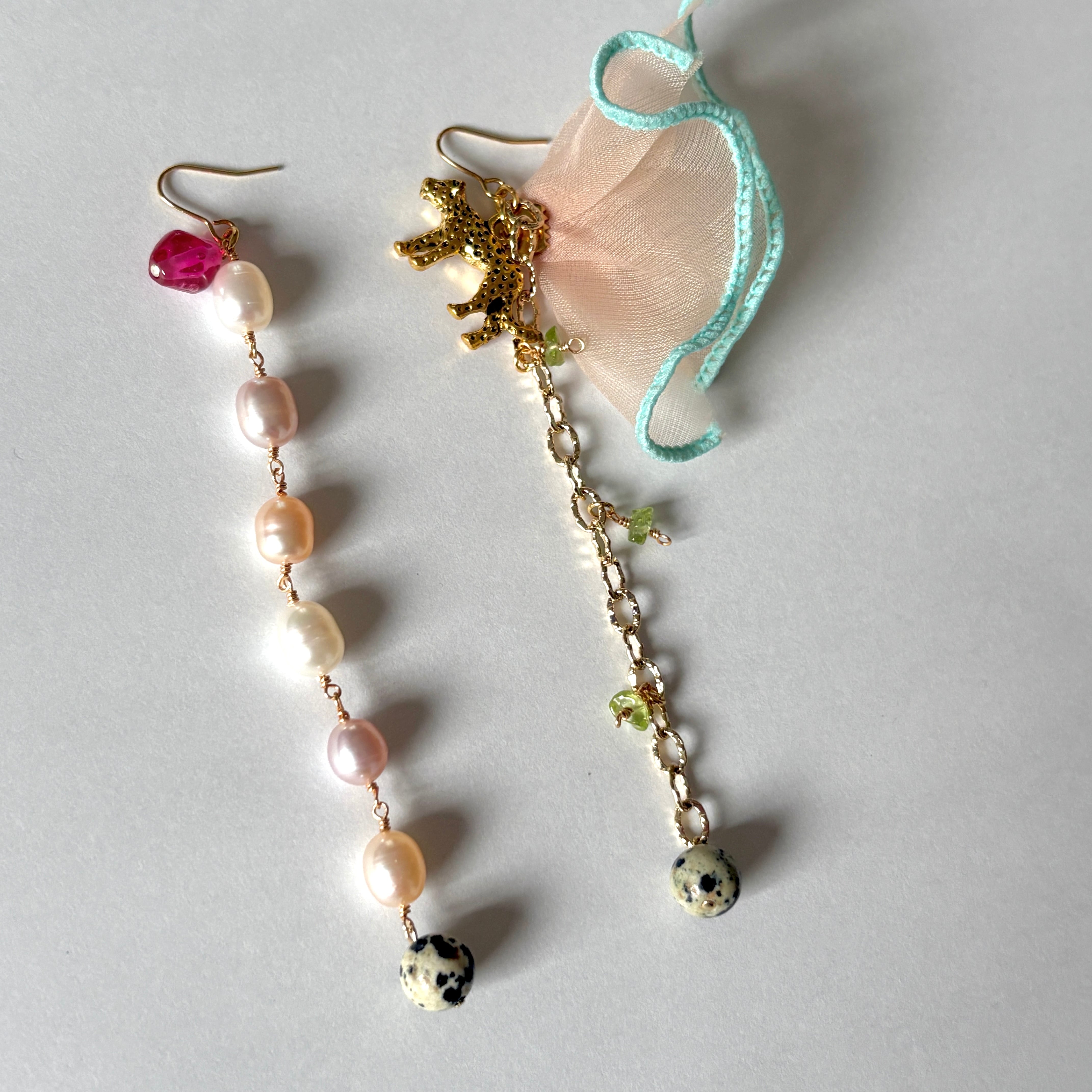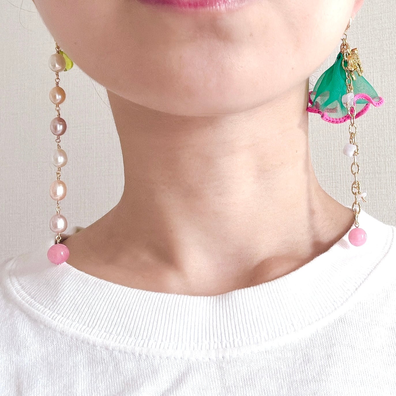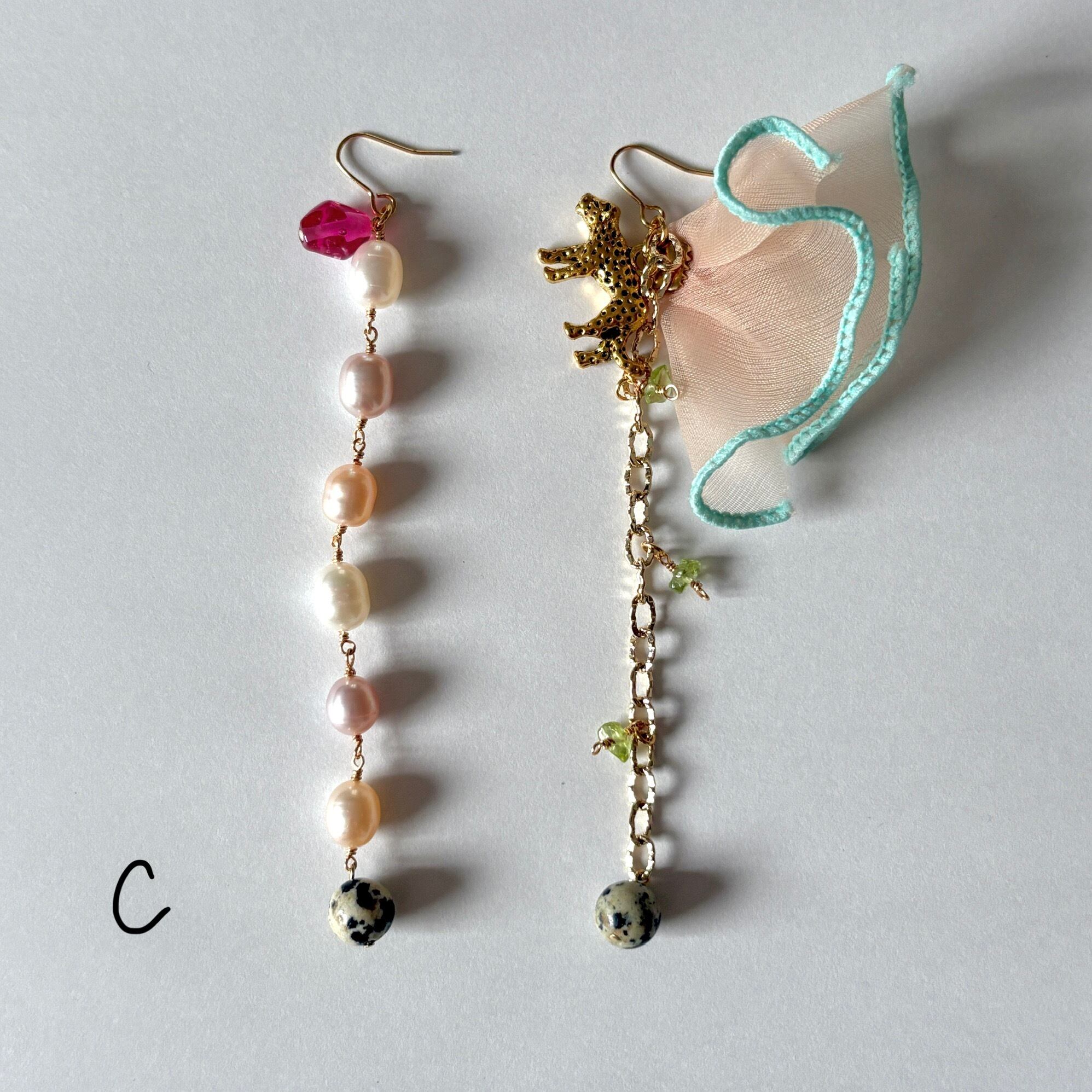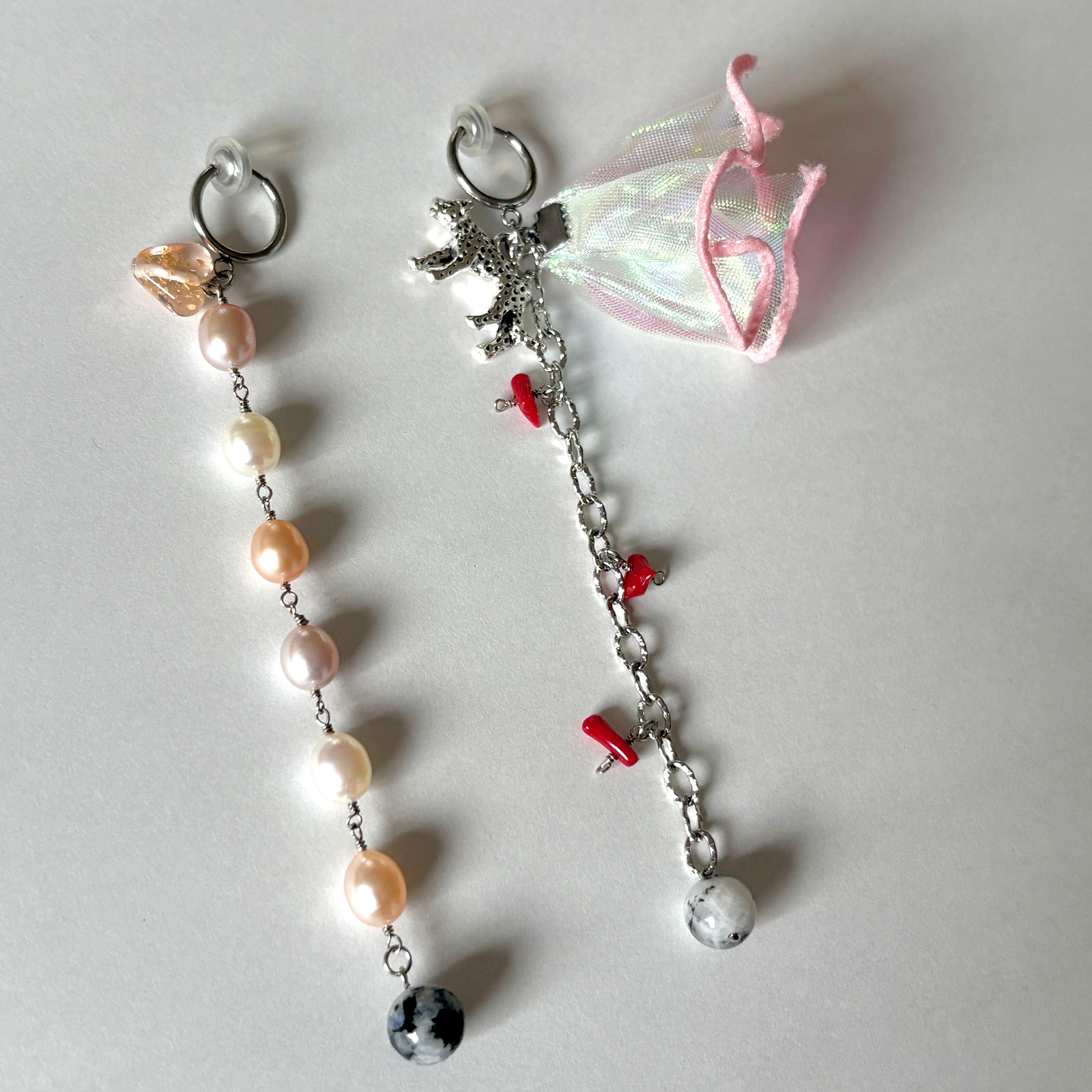 長さは揃っていますが、とことんアシンメトリーな耳飾りです。