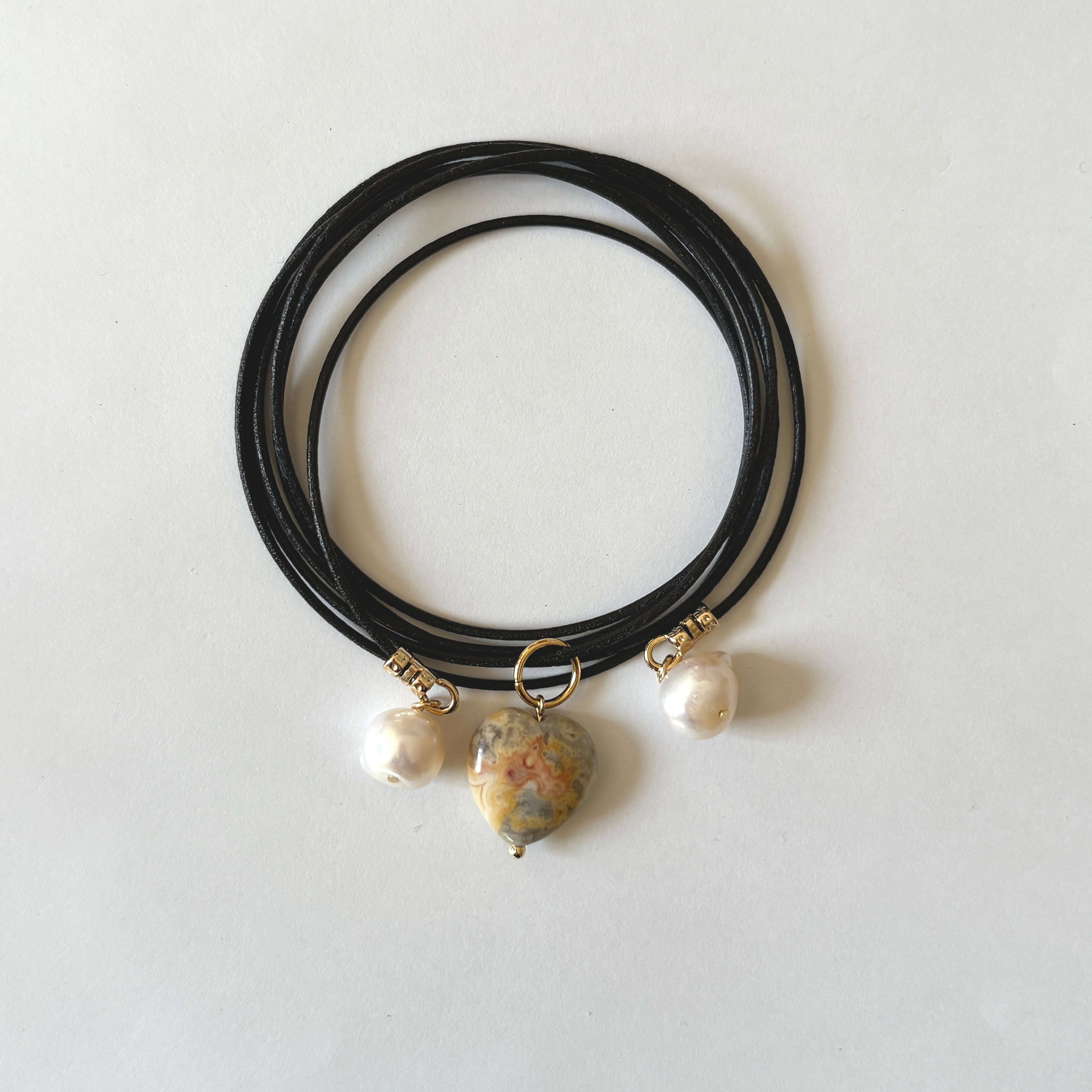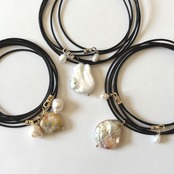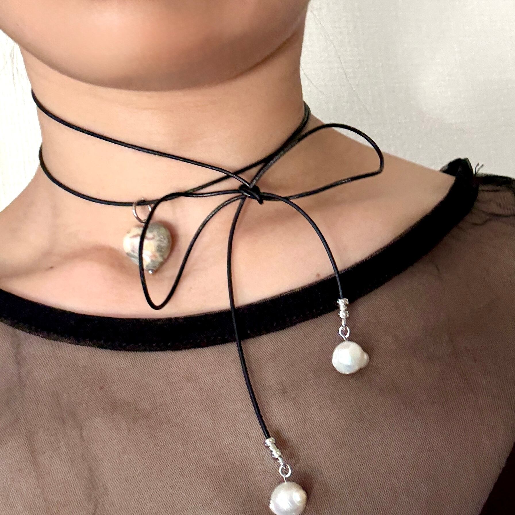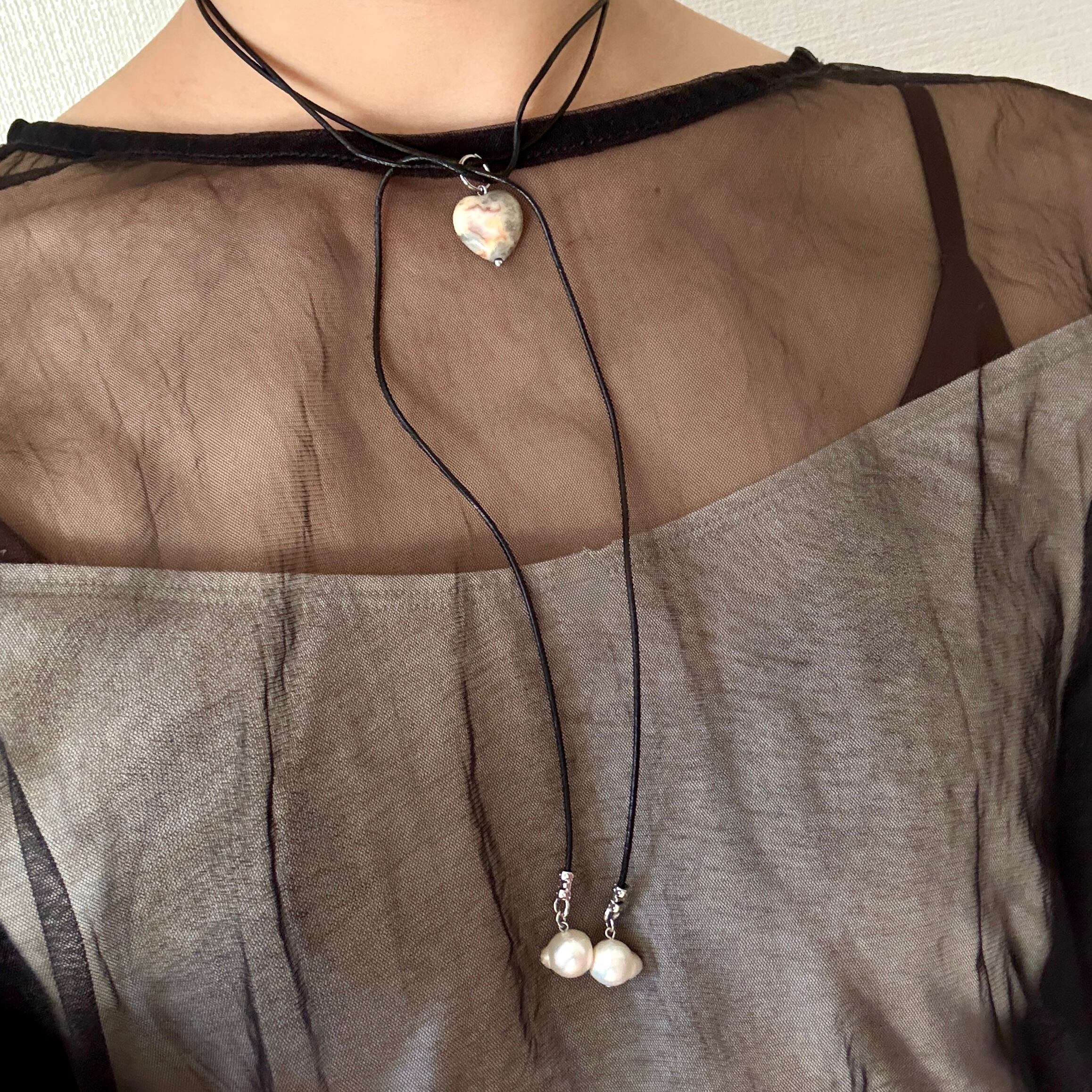 大粒の淡水パールや、天然石のハートモチーフを使用しています。