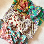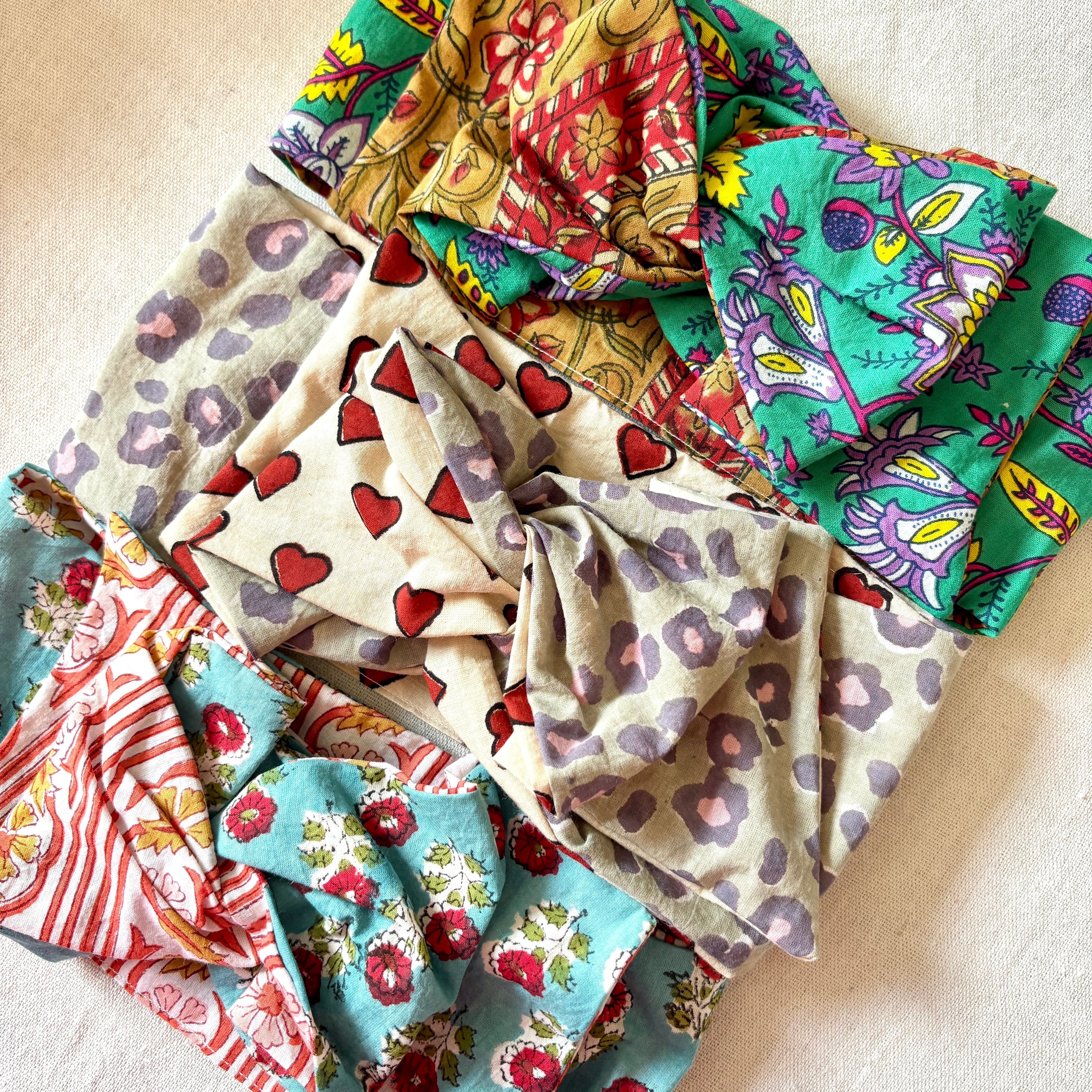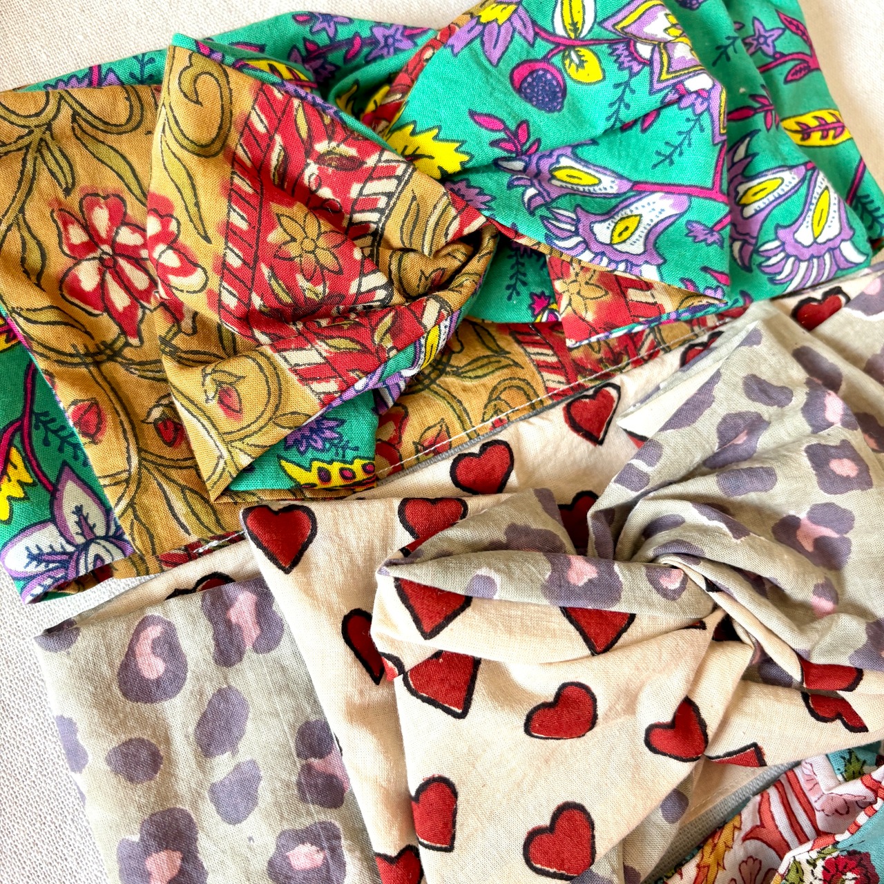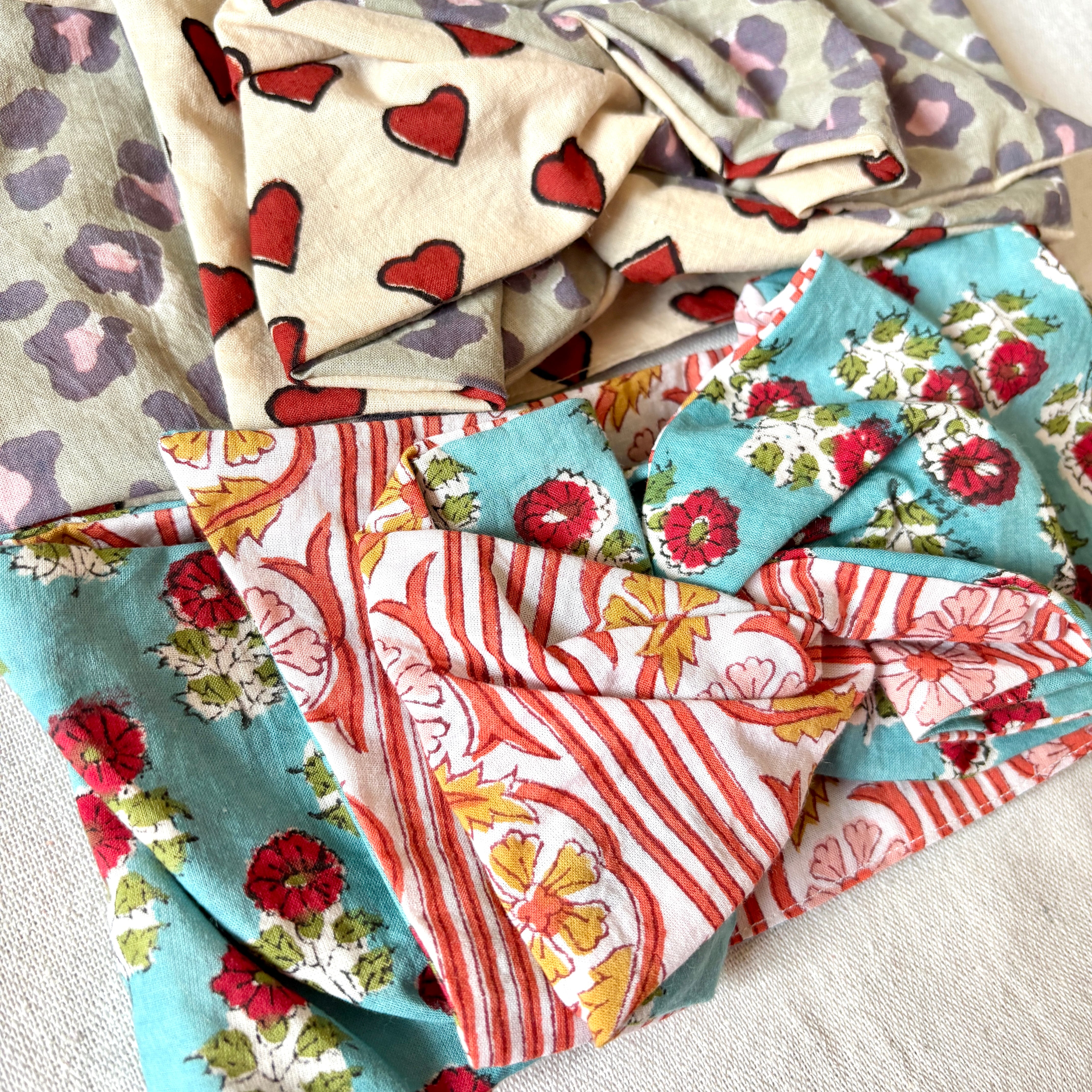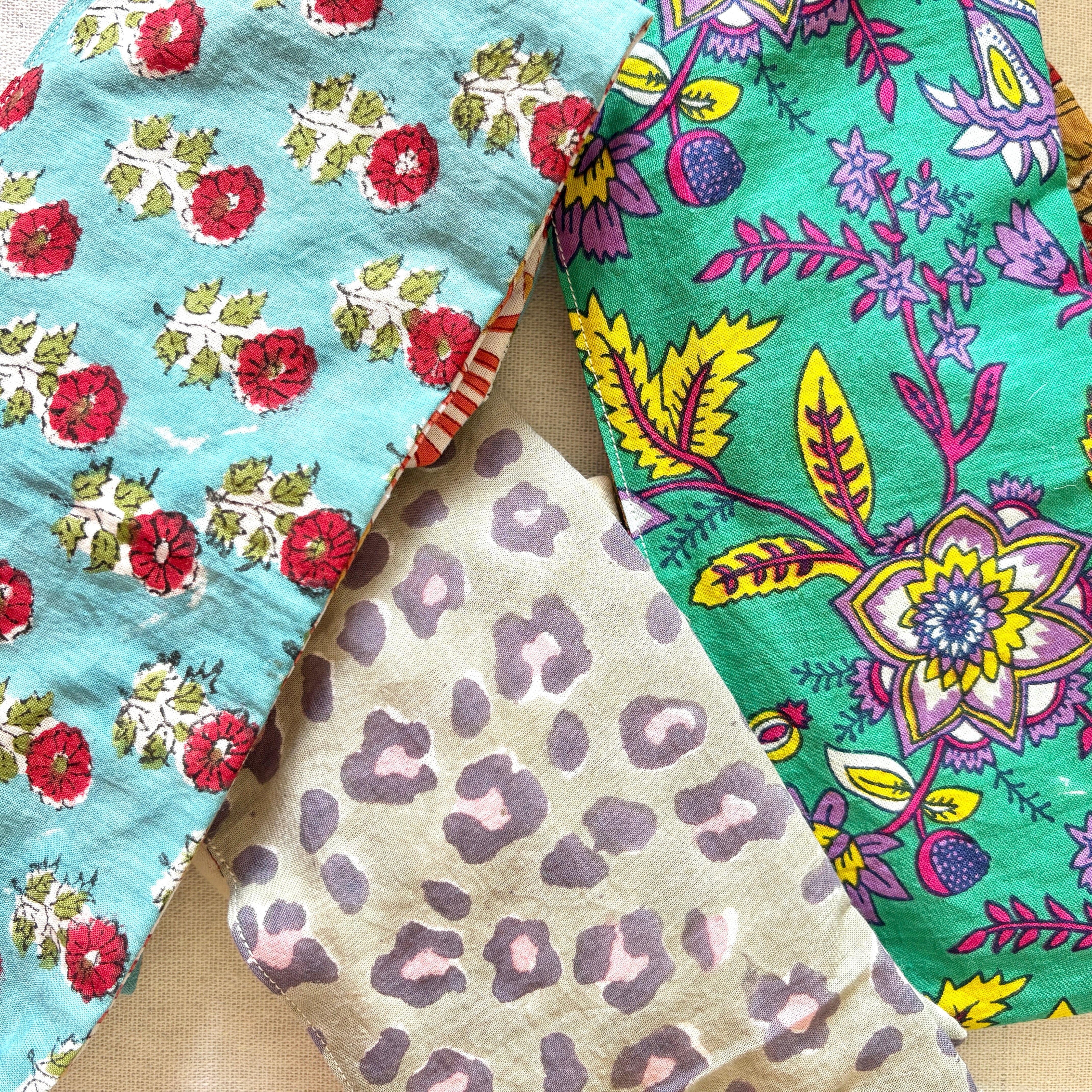 インドの伝統技法です。模様を丁寧に彫られた四角い木版ひとつに対し1色を使用し、布に押し並べていきます。1色ずつ塗り重ねていくため柄のズレやインク飛びなどもありますが、手作業のあたたかみ感じる生地です。自然の染料が使われていることも多く、環境にも優しい生産方法ですが、色落ちや色移りはしやすいです。