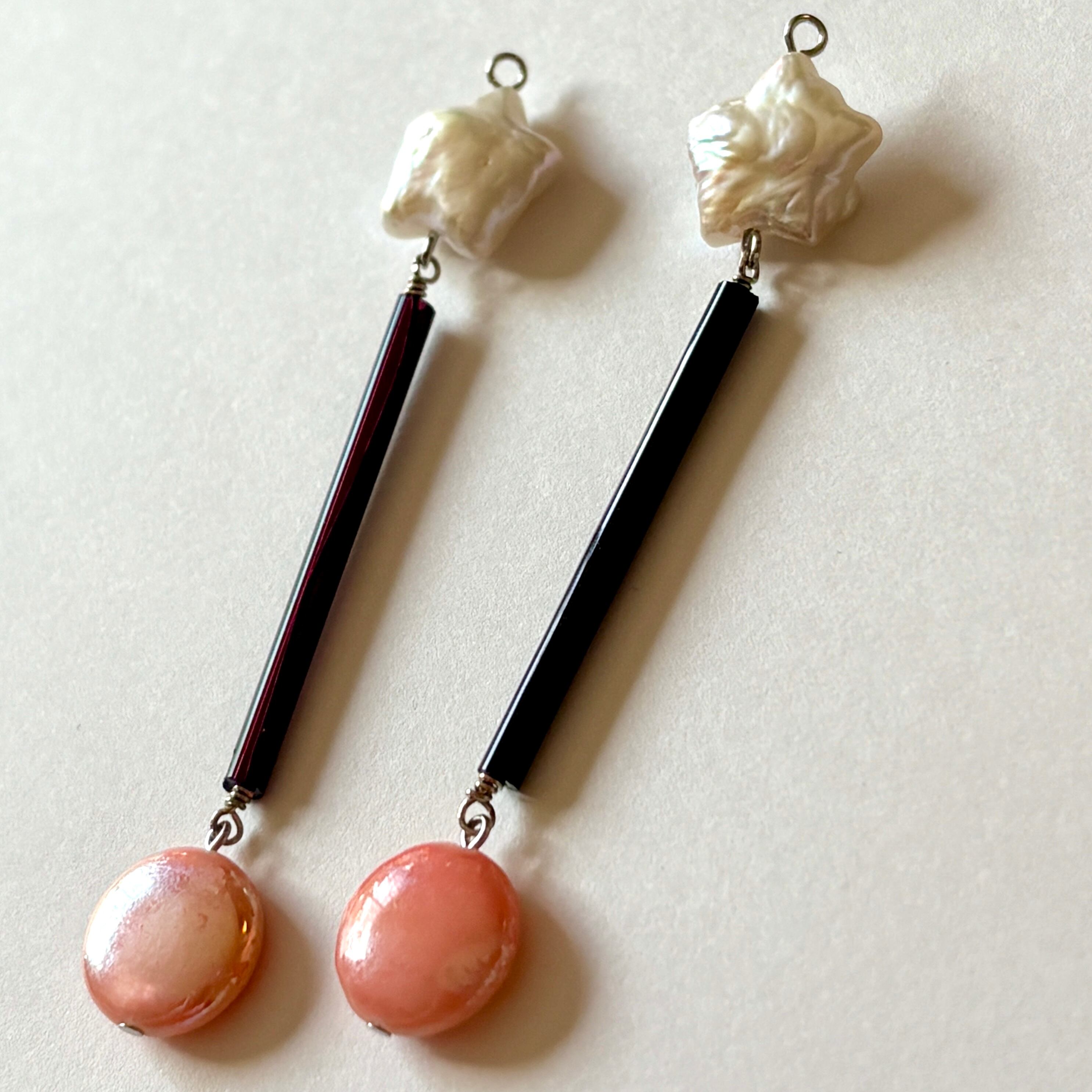 淡水パールとブラックのバーパーツのシンプルな耳飾り。