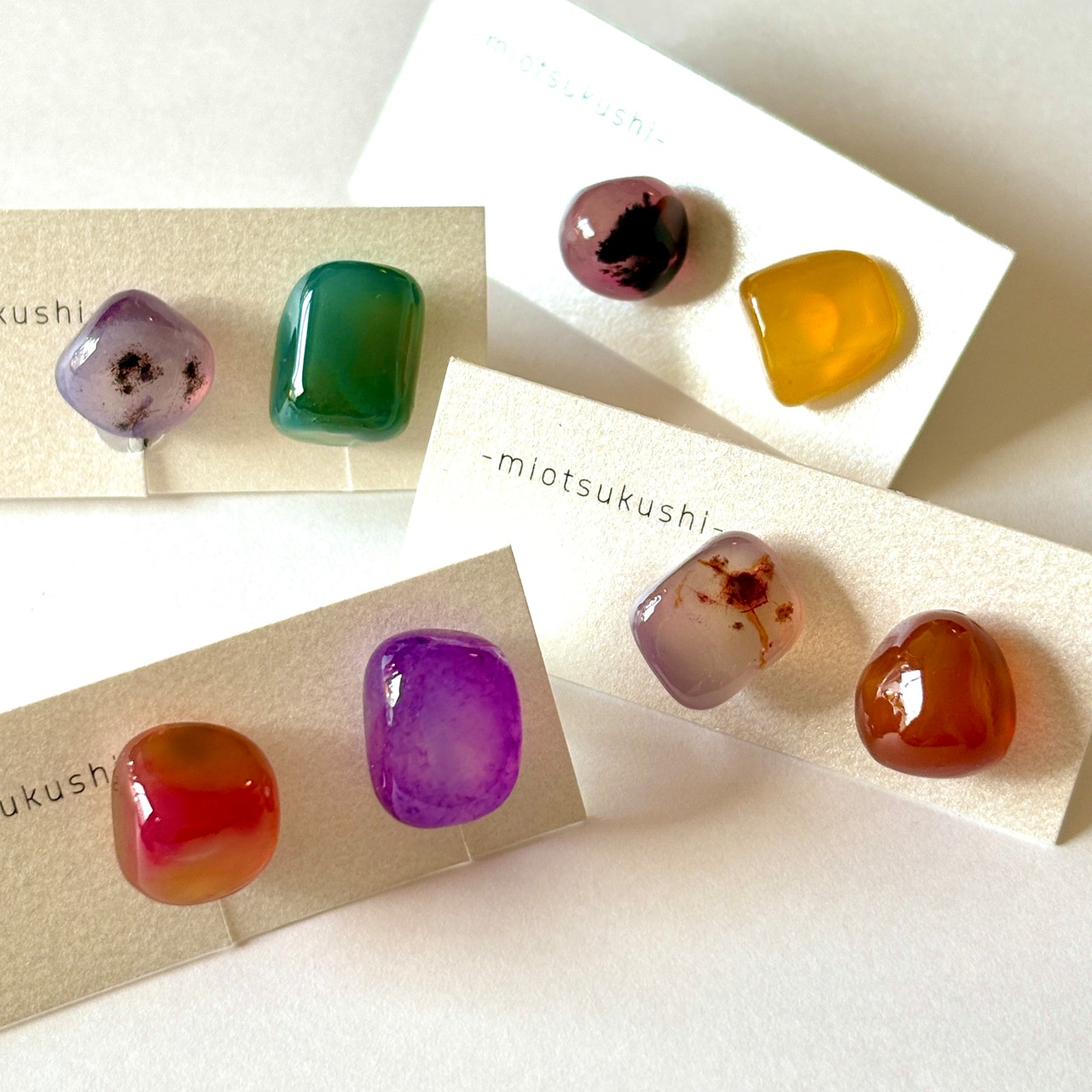 カラフルな染めの瑪瑙石をシンプルに一粒で仕立てたシリーズ。