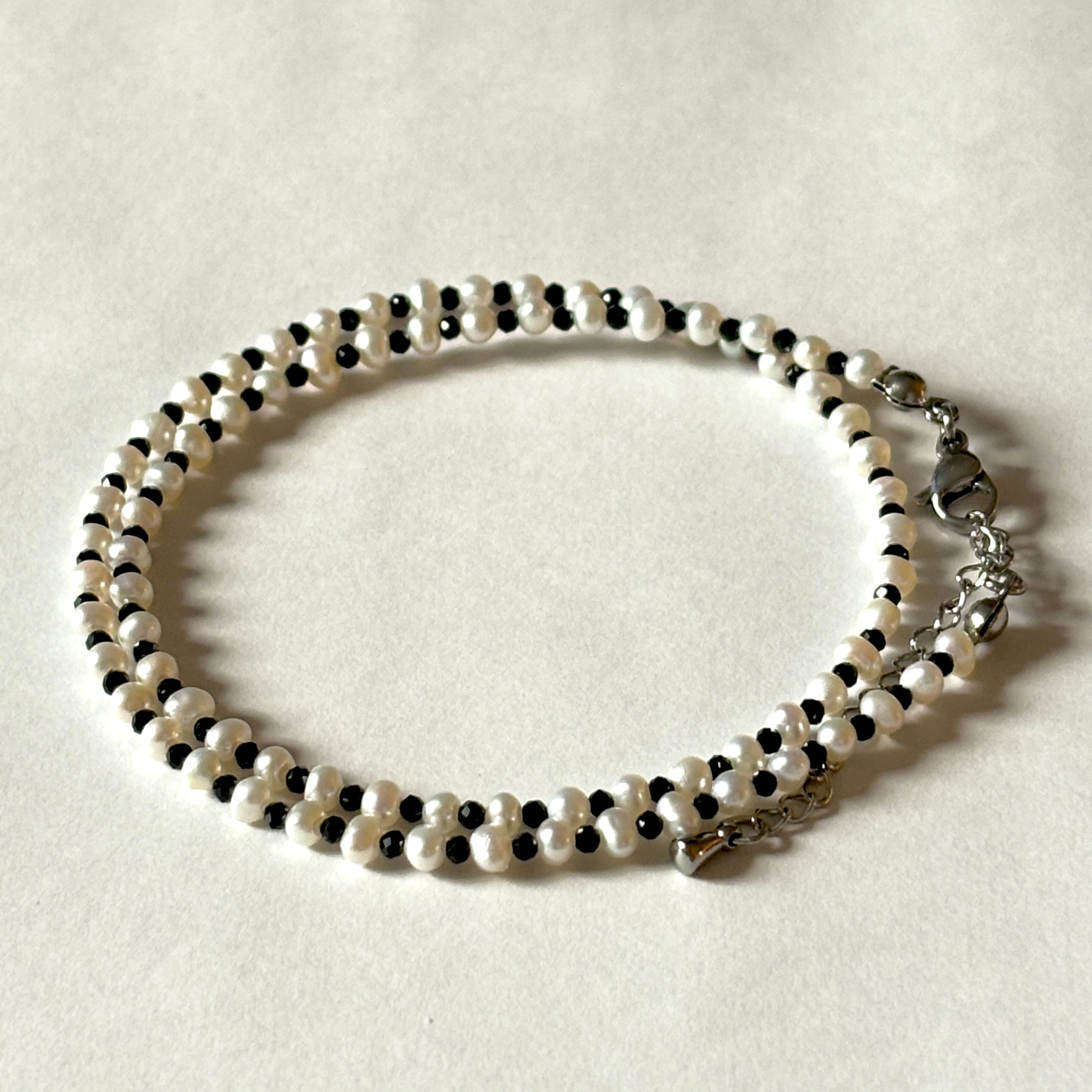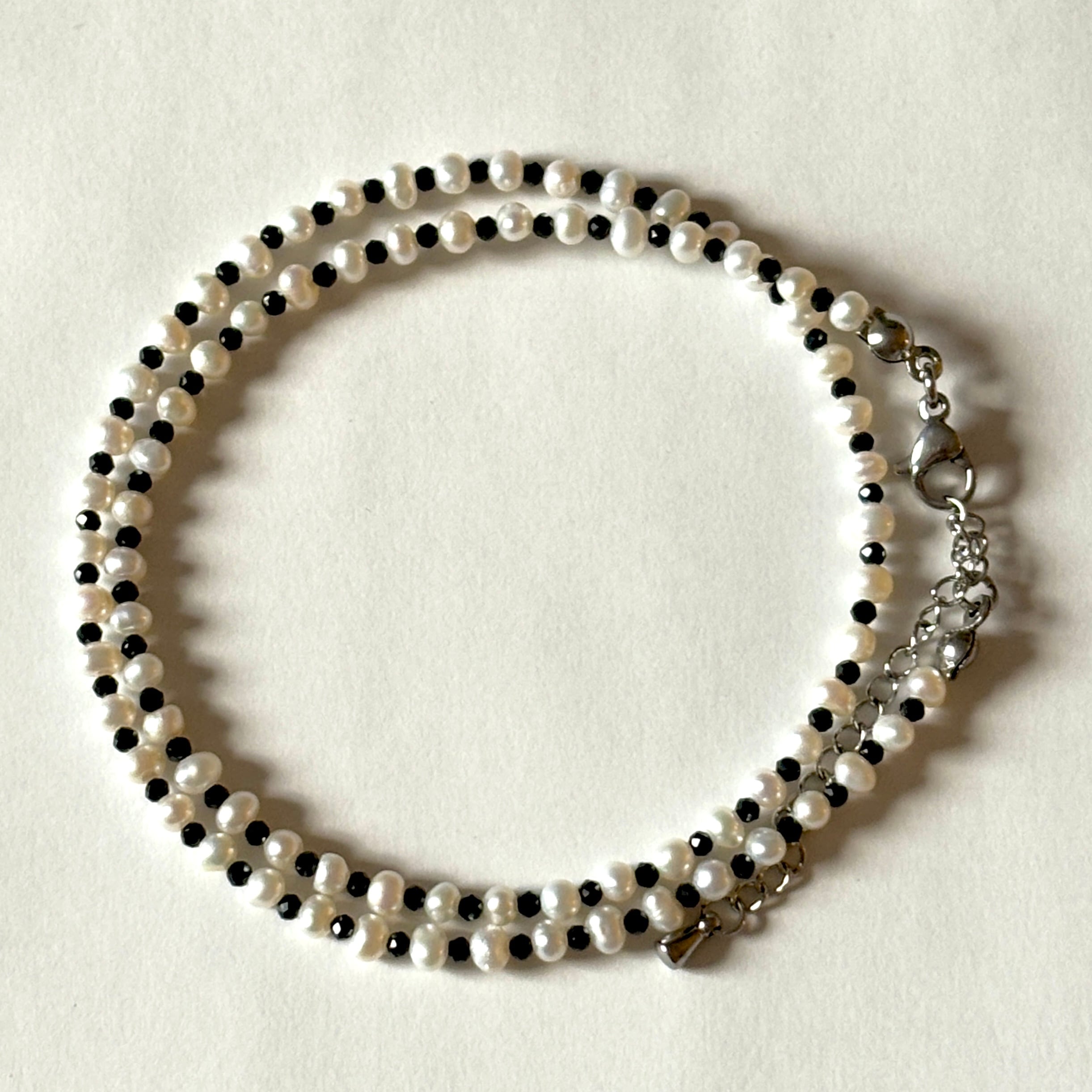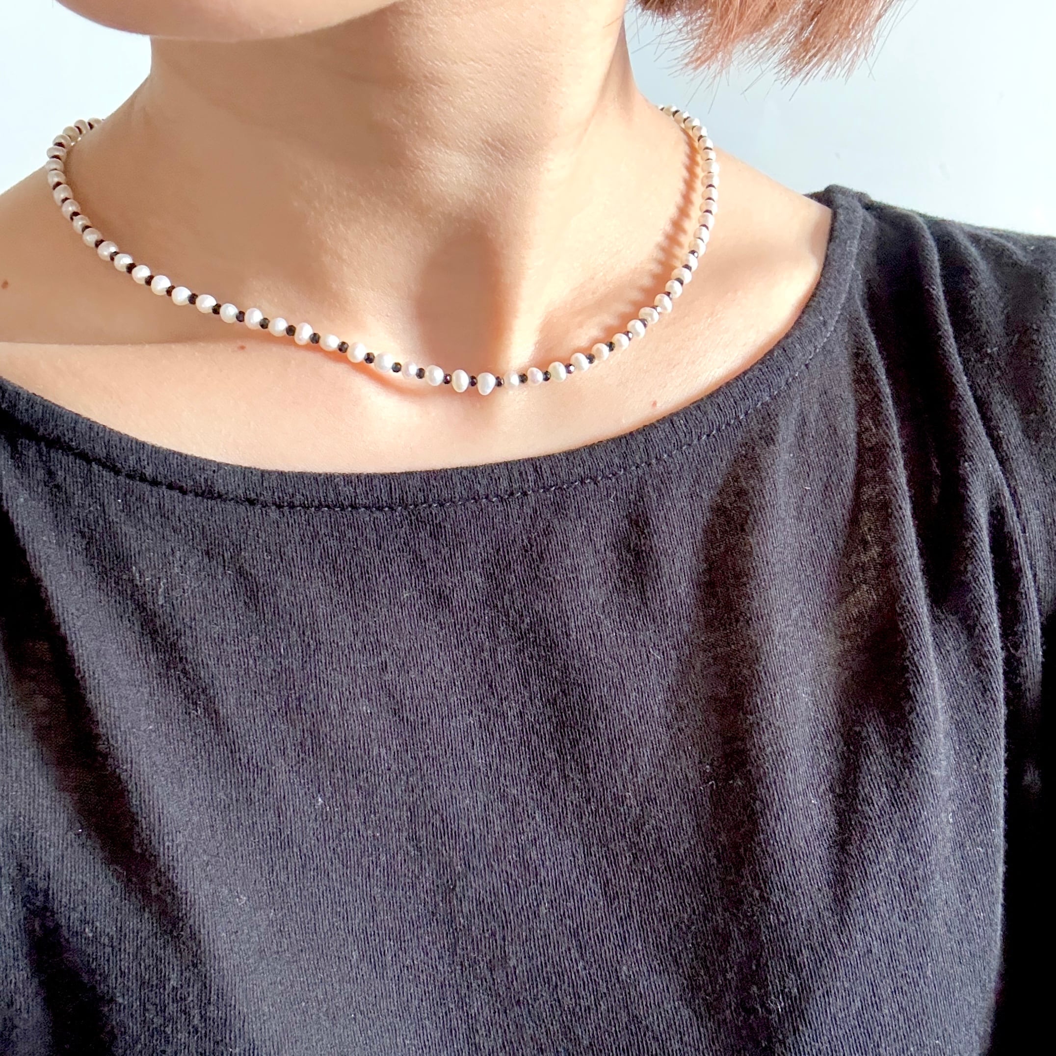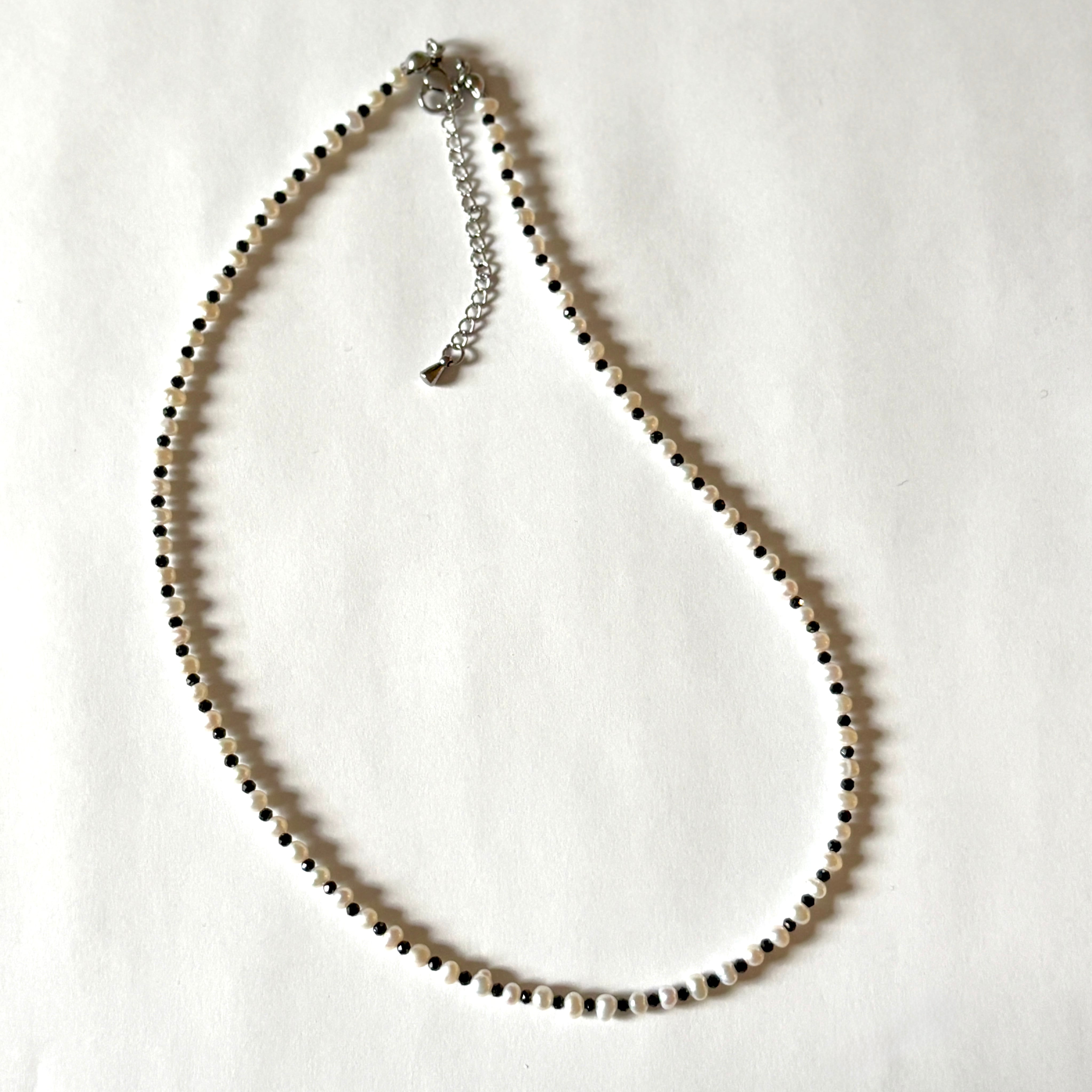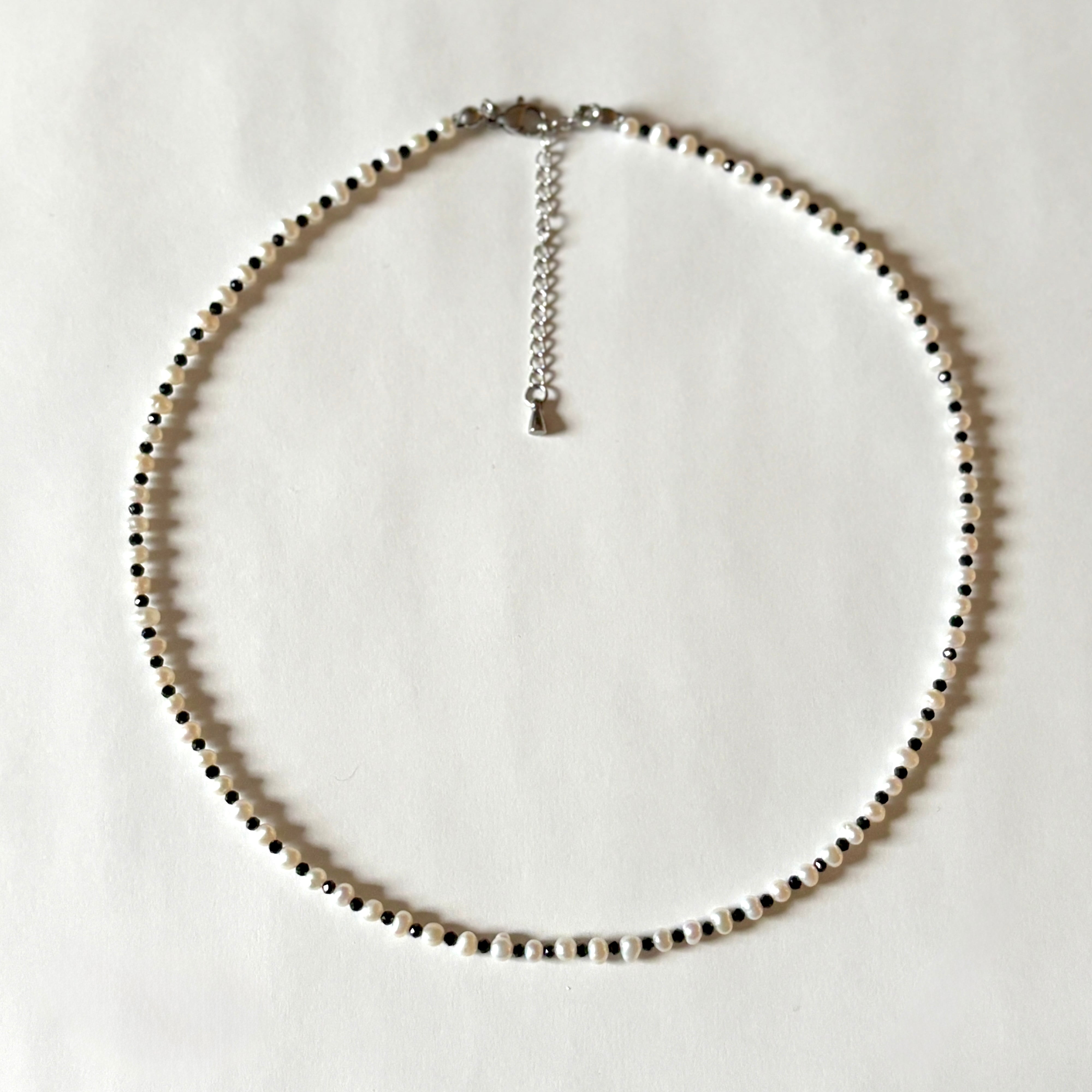 高品質な小粒の淡水パールとブラックスピネルのネックレス。